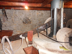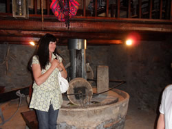 Stage 3: The fruit is then fed into the silo, from there they were fed on to the presses stone wheels, a donkey was used in this case to work the press, turning the three grinding wheels on the stone as the olives where fed. The wheels compress the olives into a form of dough, which runs in to a trough and off the press in to a container.