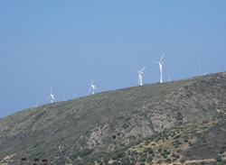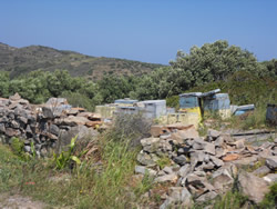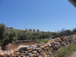 We now make our way down the hillside, passing many of the old windmill ruins, it is pointed out as we pass a collection of about six, that an Englishman had bought them and rebuilt one as his home? As we descend we see many of the bee hives, they have great pride of both their oil and honey on Crete? We also pass today's windmills, originally they were used to produce flour for baking, the latest version produce electricity.