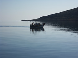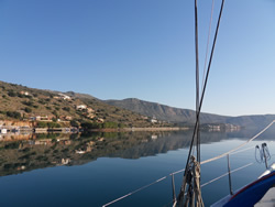 A large trawler came our way, quite fast from the shore, he dropped his nets and gear and took a route parallel to ours, only a mile or so off. He stayed with us well into darkness. As we continued east we watched the sunset, we had brief company of an Italian sailboat, they waved as the motored at speed on a westerly coarse, darkness fell. Eventually the wind fell completely, we dropped our canvas and on went the engine. We made Ak. Ay Ioannis about midnight, we now had a short trip of 8/10 miles almost due south to the anchorage in Spinalonga Lagoon. We made our way into the lagoon, between the island of Spinalonga and the mainland, an entrance of only a couple of hundred yards wide with only a little over three meters of water over the entrance. We dropped our anchor about 1am, we then tidied up down below, putting away wet gear as the nights are still cold , also life jackets etc. We then have to celebrate our safe arrival with a glass of wine as is the custom and retire about 3am - a lie in ahead of us, so we thought?