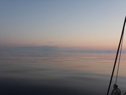 We could see wind on the surface of the water further off shore, we headed off coarse to the north to try and capitalise on it. Soon we had a slight north westerly wind, we unrolled the headsail and off again went the engine. With the headsail "poled out" we were making a could 3 to 5 knots, we stayed with this for most of the rest of the journey, the wind varying at times slightly in both strength and source.