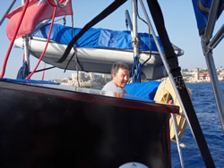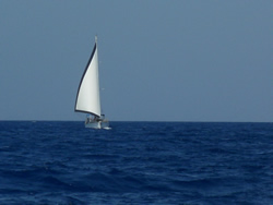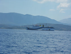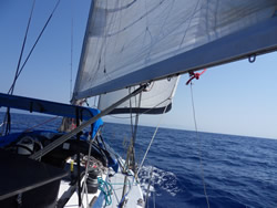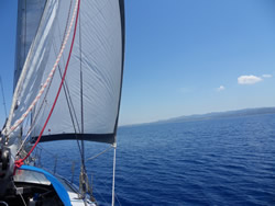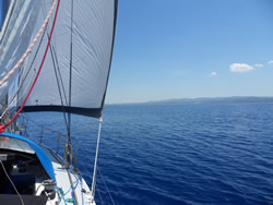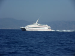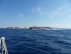 We hold Sailaway to the centre of the harbour as we secure the anchor rope and chain, store lines and fenders. In approximately fifteen minutes, three ferries and two power cruisers had made their way around us - time to leave before all are awake? I read in a Cruising magazine " It is best to arrive early in Mandraki and watch the entertainment, rather than late and become the entertainment" - a perfect analysis we believe? We are soon out of the ancient entrance, between those ancient, massive columns, Ann still doing the final tidying up with the fender covers. We have a stiff westerly wind and we soon have our canvas up, moving fast through the water and negotiating the traffic outside.
