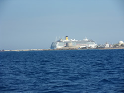 We had now been traveling for over thirty hours, as we approached the entrance to Mandraki Harbour, just the sight of the continuous trail of large commercial traffic ahead of us soon had the adrenalin running and our tiredness was forgotten. Rhodes is made up of one pleasure craft harbour (Mandraki, in the town centre) this includes all of the small to medium size traffic supporting the tourist traffic and a number of other harbours for the larger commercial traffic, unfortunately, they all share a similar entrance/exit.