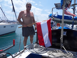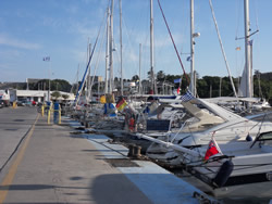What followed next made me feel like John Clees in one of the Faulty Towers sketches, pretty unhappy with what was going one I turned away. As the vessel motored away from the berth again, the gent on the helm shouted to me "Mister, my flag, save my flag, save my flag". There was then a call from a lady a couple of boats up "The flag is going under your boat, under your boat!" Like I was interested? I thought the better of it, maintained my posture and dropped the ladder on our stern into the water and began climbing down to reach the flag. As I began my decent I am shouting "Well, lets save the flag, to hell with every thing else, as long as we save the flag?" When I realised what I was saying and how I was saying it, it did bring a smile to my face? I recovered the flag and staff and put it safely on Sailaway. Then I realised the guy was having another attempt at hitting the berth, this time the wind caught him blowing him across our stern. He was now sideways to our stern, our dinghy acting as a large fender - of more concern our anchor rope was between his keel and rudder, close to his propeller obviously. I began shouting to him to stop his engine, pointing to the anchor rope underneath their boat? I was not ignored completely, his wife (I assume) came over to me and held her hand up as if to say "keep quite". Her action put me into a totally relaxed frame of mind as you can imagine -OR NOT! I tried showing her the problem but she was not interested, by now they were busing people in from nearby cruise ships to shout at, well, any one really? Only joking, but the harbour staff had by now disappeared! Then the worse thing happened that could have - the gent at the wheel opened his throttle trying to drive the boat out of the problem? There followed a number of bangs, rattles, our anchor rope went tight and the Austrian's engine stalled - he now had our anchor rope around his propeller and was completely stationary, going no where? The gent from the bow of the boat came to their stern, I explained what I saw as the problem, he stripped off, with goggles and snorkel disappeared down below - it was confirmed, the rope was not only around his propeller but also his keel (hull). I asked for a couple of minutes, Ann took Sailaway's bow to hold her off the quay and I tied Sailaway to Pete's boat next to us? I then loosened off our anchor, dropping the rope to the sea bed, the man in the water requested a hammer and large screw driver and disappeared below again? There followed a series of attempts with the tools, in between breaths and eventually he surfaced to say all was clear, the wind took the vessel away from our anchor line which I re tighten. This time the man from the bow dried himself off, started the engine and reversed the vessel toward the berth, we, either side of the "potential berth" asked for lines to pull them in - and that is just what happened. Once they had secured themselves up I ceremoniously presented the flag staff back to the crew, who were clearly some what embarrassed about the situation? We will not know if our rope is damaged until we leave tomorrow, our dinghy and the rest of Sailaway seemed to have escaped any damage?