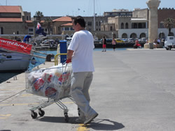 A story worth telling - we needed to do a reasonable size shop, our options were to either use the large store near the centre, or hire a car and go to one of the larger supermarket on the out skirts of town? We looked into the city store and they had all we needed so as I had seen a store van parked outside I enquired about delivery and explained about our problem? Delivery was no problem so we began shopping, and eventually filled two trolleys. I then found the lady that had agreed the delivery and told her we were ready to checkout? There was all sorts of noise and comments from various staff, they then called the van driver and we were told all was fine? The above gentleman carefully packed our trolley, we were to leave the store with him, we thought to accompany him in the van to Sailaway? No nothing as straight forward, the guy shot off down the street, it became clear after some time, there was no van he was taking our trolley to Sailaway? We felt he got sick of waiting for us some times but it worked out well in the end?