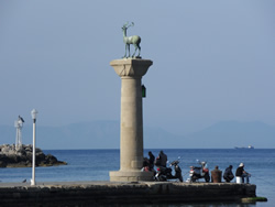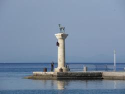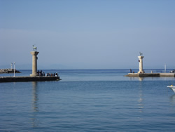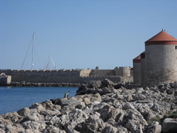 The perimeter walls around Mandraki Harbour, the two ancient columns have guarded it's entrance for centuries.