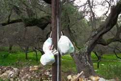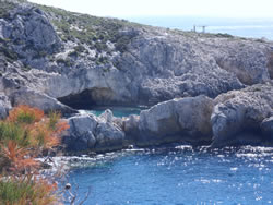Our walk answers one of our questions "What to they do with their rubbish?" A part from the unfortunate litter which does spoil the island but in time becomes "the norm" in ones eyes, there are no skips which is the norm, even on Kalamos they had an area on the harbour where every deposited their rubbish. Here there is nothing, but many large signs telling visitors "Kastos has no rubbish collection, so please take all rubbish home with you". We now know differently, they do have a collection system, they just do not want visitors rubbish! We find a number of telegraph poles on the main roads around property, with large nails driven into them at a height of about 1.5 meters. On these nails people hang their rubbish, someone then obviously collects it - we do see a red pickup active on the roads a lot, perhaps that's his job? We walk as far south as the road will take us, down to a small cove where two buildings are being erected - shame, the rubbish from the site destroys the cove as nothing is collected as the building is being erected. The ground is littered with plastic bottles, bags, broken wooden pallets, every thing one would expect to see on a building site except "builders, and they have been gone for some time!