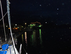 It took some time to get off shore as our progress was slow, the sensible thing would have been to turn north and run with the wind, there was no secure shelter that way and I was concerned about the seas being funneled through the narrow channels to the north of us. We turned south, the wind was now any where from north west to south east, varying in strength from 6 to 30 knots, it was easier to keep the canvas down and motor, our speed varying from 3 to 7 knots depending upon wave and wind direction. Just when we thought it could not get any worse an electric storm came across us, the rain was horizontal, steering became very difficult at times, a few 360 degree turns forced on us by gusts and seas but we were making reasonable progress south towards Ithaca? Once the electric storm passed over head, others followed but north of us, we were able to work the seas and change into spare dry cloths, what a luxury? Darkness fell, the wind turning more to the north gave us good progress, our issue was now with shipping, on route from the mainland, one vessel causing us to take avoiding action - "thanks very much" we said to him in a polite manner. The noise was unbelievable, the seas confused, one moment we were surfing down a wave, then the next would hit our port side, pushing us to starboard? Ithaca was now only a couple of mile away, as we approached Kolopos Aetou, the large inland recess off which Vathi lay, we began to benefit from it's protection. It was not long before the wind was slight and the water like wise. The night passage into Limin Vathi went without issue, we dropped anchor about 10pm!