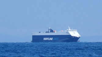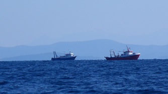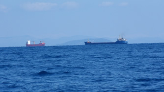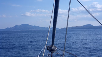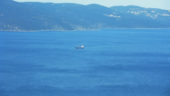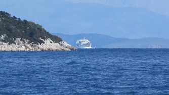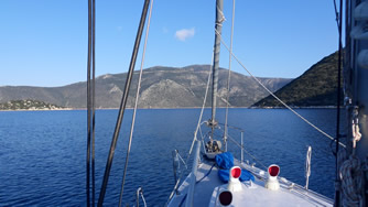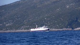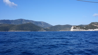 As we cleared Ak. AV. Ionnis the most southerly tip of Ithaca, Sami (Cephalonia) came into sight as did the ferry as it crossed to our stern making for the mainland. We had been paralleled by two trawlers for some time "zigzagging" down the coast, their path never colliding with ours, so it was only necessary to keep an eye on them.
