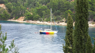 We have in front of us, a fifty foot sailboat, we though left here for the winter? We had seen periodically the local coast guard personal on board, with keys? Sailaway and this "Didum" are the only boats in the Ormos.