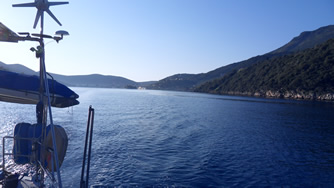 Once outside, the winds became very light, but not from the north, from the south, completely useless to us? If we cleared the head land and the wind stiffened it may be easier to head back and try another day, rounding the point further confirmed a southerly wind but only of 2 - 4 knots, we decided to carry on! We were making a good 5 knots on the engine, we had put the main sail up which assisted us as the southerly gusts came and went?