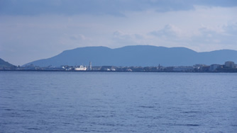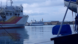 With the harbour entrance now visible, we turn for it, we watch for traffic, mainly fishing vessels no apparent movement from ferries moving out or in? Our pilotage information describes a partly built marina, that would have been attractive to us as it would mean free berthing? It's state declared in the pilotage was greatly exaggerated, the protective sea wall was no more than a row of "spaced", huge concrete blocks - not much shelter at all? Our target area for berthing within the main harbour was behind a ferry quay, this would give us good protection from most directions. We cautiously made our way in, our timing was perfect, there was three large ferries in - not one moved during our arrival! We tie up "bow too" behind a large ferry on the terminal, it was under going some form of refit which guaranteed great shelter. There were a number of vessels, including trip boats tied up along the quay they all had lines from their bows to the quay. This meant that there first, visually appeared to be plenty of space available but on close examination reviled that due to the bow lines zigzagging across these spaces we were restricted to one available berth. It was a good job we were not arriving in the dark, the lines had clearly been laid and over time had "stretched", therefore most of the lines were in the water!
