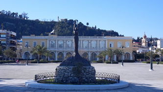 Solomos Square is to the north of the water front, the square was gradually recovered from the embankments formed by the sea and today has an impressive array of public building, the Museum of Zakynthos, City Hall, The National Bank of Greece, The Cultural Centre and the Church of St. Nicholas. Incorporated in to the square is the bust of composer Paul Karrer and monument of the National Resistance. An impressive square, many of the cafes not yet open.
