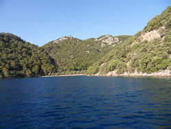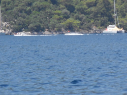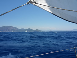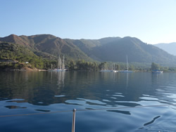 Once in the bay the wind stiffened further, with local gusts? The sea was now about two meters so we rolled up the genoa and continue on main alone. We watch as most vessels had there own idea's on dealing with the wind strength, we watched one try to continue under full sail, rounding up twice before he reduced sail. Others turned back out of the bay to drop their main sail and continue on under genoa only? Different boats, different skippers all with their own ideas, but we all get there in the end? We checked out a few anchorages before we settled, some too exposed to the winds, others full of charter vessels with more piling in - no thanks? One of the most annoying things we witnessed for the first time was vessels cordoning off alongside areas with ropes across to the shore from their vessel? We saw a large American flagged vessel moored off a small beach, they had lines across the entire area eliminating the possibility of others joining them off that beach? We saw this practice in a couple of places, clearly not an attempt to increase their own stability but to restrict that area to themselves? I felt there should be a way of fining the offenders, the local authorities are quick to fine you apparently, if you tie to a tree, or pump out even grey water, so there must be some one patrolling one would think?