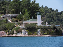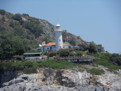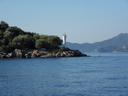 We are taking the channel to the south of nearby "Kizil Island", better winds for us, we are soon to the channel between "Fethiye Island" and "Calmi Br." off the mainland. There stands quite an impressive light house, which, when we look closely, "doubles" as a restaurant - enterprising?