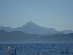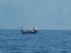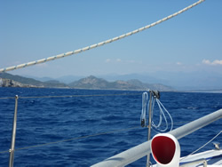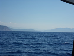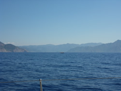 Unfortunately the mist never cleared but the sailing was good, visibility only improved as we approached land, we were to pass between Kurdögul Br. on the mainland and the island Peksimet Adasi, then turn northish into Fethiye Körfezi.