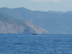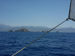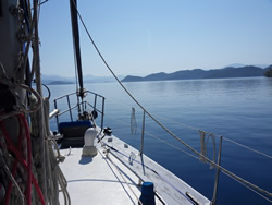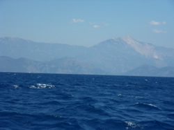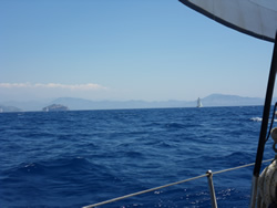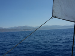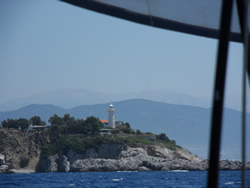 The wind is almost nonexistent, we round the lighthouse at Ince Burnu making our way through Sark Bögazi into open water, Rhodes is just visible through the mist.