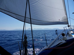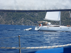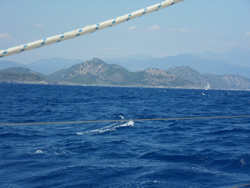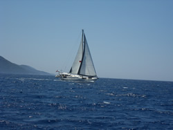 Within a short time the winds had stiffened from the south west, we were now screaming along most of the time at maximise hull speed of about 8 knots. We soon cross Köcegiz Limani and made it to our intended stop over, the swell could be seen making it's way in but also, we had such good wind it was a shame not to utilise it? Tomorrow was forecast to be lighter winds still, so we decided to continue, we were now coming across many other sailboat heading in our direction. They were probably unaware of it but it was clearly now a race and we were clearly to win. Ann beckoned me to relax and calm down, but it was not to be, we were to get there first!