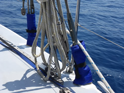 Our boat is steel an you know, our rigging mounts are steel, welded to the deck, good and strong. The rigging bottle screws are secured to the welded flanges on the deck. To eliminate any strain on the steel the welded flanges are bushed with stainless steel inserts - the theory it it eliminates rust and therefore the annoying yellow streaks down the hull? It does not work, the only way we have been able to eliminate these yellow streaks is to coat the lower flange assembly with white marine grease. The sun soon turns it a "dirt white" and as it was exposed, one easily catches it with ones foot and therefore transfers the grease around? To eliminate all of that we stay with the marine grease but Ann has made gaiters to fully enclose the grease. Therefore much more pleasing to the eye although I will miss the call "I think this is grease!" Still one cannot have every thing in life? The patent is applied for, they are readily available from us to all steel boat owners at €15 each, in a choice of five colours - postage additional at cost?