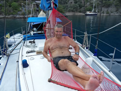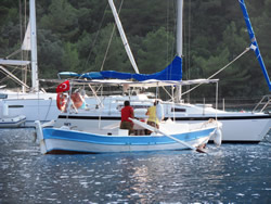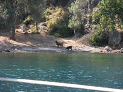 The traffic outside seems to demise, all need to be tied up some where for lunch I guess? The ice scream man arrives in his small boat, he wishes us well again in our new anchorage? I jokingly ask for discount for "good customers", he gives us a reduction of 2TL on two ice screams totaling 12TL and bids us farewell. Following a snorkeling session around the bay. we put out the hammock for Ann - Ann hears goats?