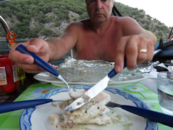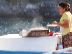 The daily barrage of "boat boys" as we call them can supply you with any thing from the daily bread, home grown produce (from salad, cheese to olives/oil,) to take away meals from the nearby restaurants? If they cannot get you what you need, they have a friend that can? You are paying a little more but it's fun driving the price down! There is guy (centre picture) who motors around the anchorage twice a day calling "ice screams!"
