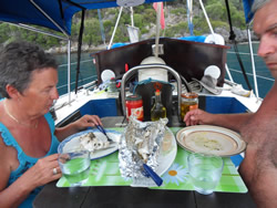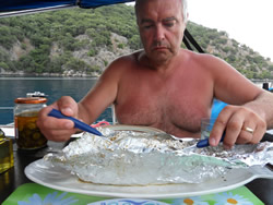 The fish, once cooked, is lovely, I am tempted to say "the best fish we had for a long time", but it is the only fish we have had since Pilos (Greece). There was however too much for two people but we made our way through it, washing it down with delicious cold water! It was such a size that once devoured, all that was left to do once I had washed up, was to retire early?