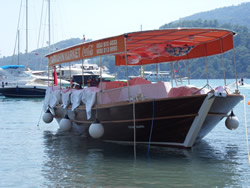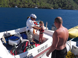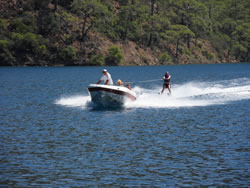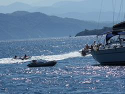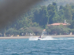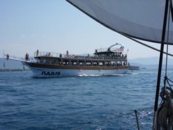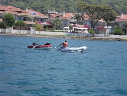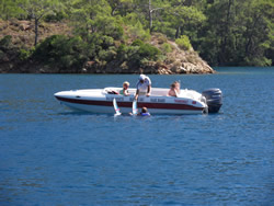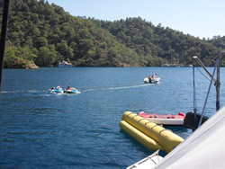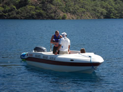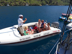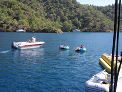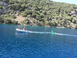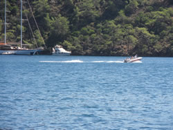 As we cleared Tavsan, Delikliadalar and Kizil islands to the north of them we began to head inland, passing a nearby resort we caught the attention of a gent on a jet sky, he came well out to see us? The tourist traffic from Fethiye now began to develop also, many vessels all giving way as they should.