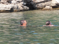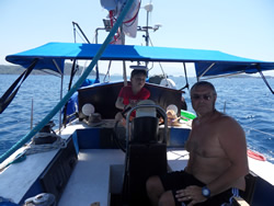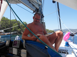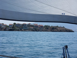 We discover we had a problem with our holding tank where the toilet waste is pumped into, we needed to pump it out at sea as the holding tanks are force in the Limani, but there are no pump out stations. We make ready to move, Trish takes us out to empty the tank, the "cat nap" seemed to have done her good? Once our tank is empty we return to the Limani and make for a small cove in Domuz Island for the evening.