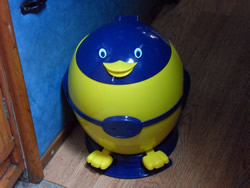While walking around the supermarket Ann got her eyes upon a waste bin in the shape of a penguin. We had been considering a closed to bin for some time due to "bugs and stuff"?