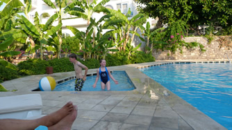 Lee and Trish were a little unhappy with their hotel last night so they call to say they have found another and we are allowed in the pool, we tidy up and make our way ashore with the kids.
