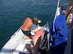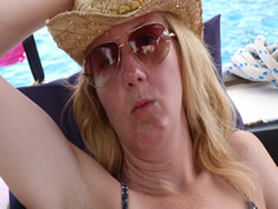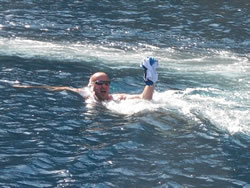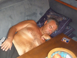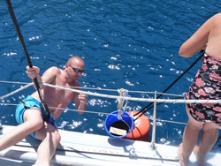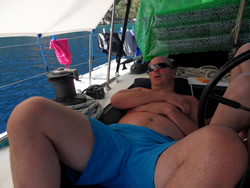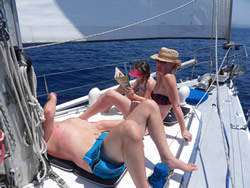 Of coarse, poor Ann is not let out of the galley, as we sit and eat some thing is noticed floating in the water, we all make guesses as to what it actually is? It is finally recognised, it's my hat, blown off the deck by the afternoon winds, Lee retrieves it!