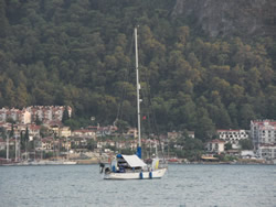Soon the entrance to Fethiye harbour came into site through the mist, it was now just a case of making for the anchorage we knew and getting settled.
