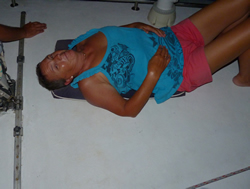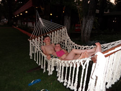 Trish decides she is to take it easy in the hammock, after seeing some nearby kids being dragged around on floating toys, we improvise with an inflated airbed and our dinghy, keeps the two small kids happy for ages?