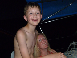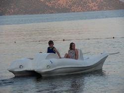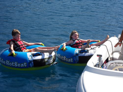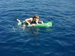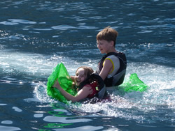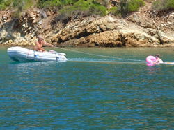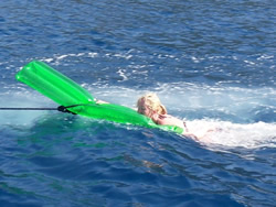 We had up graded our water toys, purchasing a large inflatable ring with grab handles for me to pull the kids around with the dinghy. They had great fun, it wore Trish out just watching?
