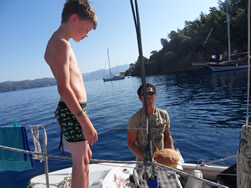 With the sails up all seemed quite relaxed, good job Reece and Georgia were with us? Eventually we decide to drop anchor in Boynüz Bükü west of the Vassica Adalari. It has a restaurant offering a berth on it's pontoon and water to it's customers. Lee and Trish seemed exhausted, must of been the air conditioning that kept them awake?