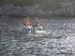 We were sitting in the cockpit, "people watching" as one does? Not far from us an elderly couple had anchored nearby. In their preparation to go ashore some how the dinghy had been released from their boat and began to drift away in the wind. I (Kevin) saw this as an opportunity to do ones "good deed for the day?" I jumped into our dinghy and shot off in pursuit, the couple, unaware we had seen the situation develop shouted over for me to fetch their dinghy. I gave them a thumbs up, recovered it and returned it to it's rightful owners. They were extremely appreciative, and came over later that day with a couple of ice cold beers to say thank you!