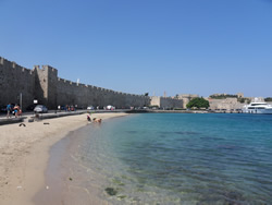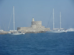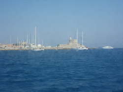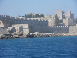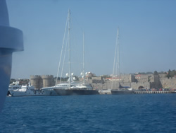 It was fairly bumpy trip and will only a slight wind behind us, it takes about 1 hour 40 minutes "southish" to Rhodes, the city fortifications soon come into view as one arrives.