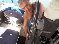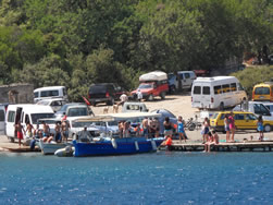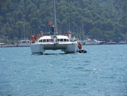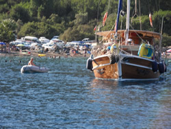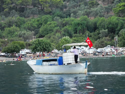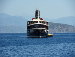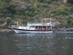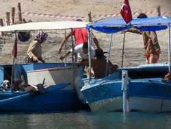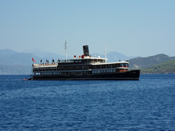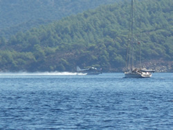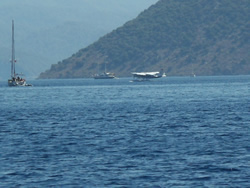 We have to travel to Dalaman to pick up the new water pump and gaskets today, we also decide to visit one of the larger supermarket while there and stock up as very little is available to us here - it also helps justify the taxi fare further in one's own mind, Dalaman being 45 minutes away, it is not cheap? We have a couple of quite unique visitors to the bay today, firstly the old Bosphorus ferry, now converted to a private yacht named "Halsa". It is beautiful to look at and has every toy imaginable aboard to keeps it's owner and guests occupied. The second is a "toilet pump out" vessel, although they say holding tanks are a must in this Limani which is a great idea, to discharge one's waste beyond the islands is a bit of a nonsense as prevailing winds and resulting currents will only bring it back in? It was good to see the vessel in use but it displayed no telephone or VHF contact details - not sure how that works? The Turks appear to us to be far more ecologically friendly, that is visible in the water also, more fish can be seen, vegetation a little bit more scarce, but in time one never knows. It would be good to see these efforts extended further into the Mediterranean.