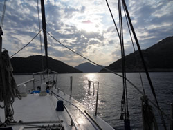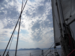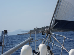 Our attention was caught by a catamaran leaving the nearby marina being pursued by the marina rib - money must be owed we guess, but it is just a guess? The afternoon winds had stiffened some what so we put a reef in our mainsail and began "beating" against the wind making our way south. Once out into the bay it was quite busy most beating as we were, all reefed. We stayed parallel to a charter sailboat for some time, it was clear we were unofficially racing - a father and son team watching our every move?