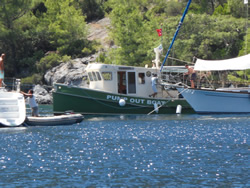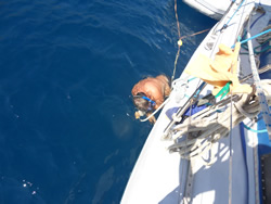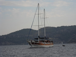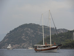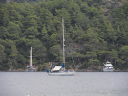 It was time for us to burst into action, we had a quick look at the growth below, a clean certainly needed, Ann and I spent an hour on it, the rest to be completed in the morning? While in the water Ann was called by the skipper of a small gullet, he asked if we could move off the buoy as his engine had failed and his anchor was dragging? Ann explained we were in the same situation, I came out of the water and went over in the dinghy to see if I could be of assistance but he declined, just then his mate got the engine running. The gullet and it's English passengers swiftly disappeared.