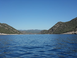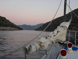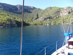 We wait and wait, the winds do not pick up at all as forecast so we decide to lift our anchor and check out the weather outside, if no good we can come back in and wait until this evening? Our anchor is well dug in, it had held well in the reported 40 knot squalls we had experienced earlier, we broke the anchor out of the mud, the bow dipping a good 300mm (12") as it did so, we had never experienced that before. We our anchor gear secured clean, we left Üçagiz Limani, and headed across the Roads to the western exit, passing between Kekova Adasi and Karagol Adalari we were now in open water following the mainland coast west.