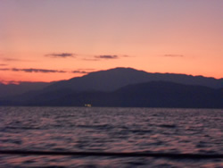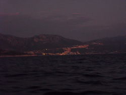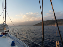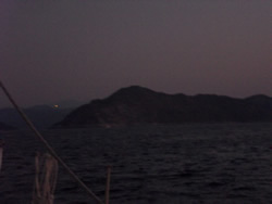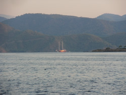 We motored on for the last ten miles or so until we came to the entrance of Fethiye Körfezi, as we did so the sun began to rise. As we entered Ann awoke me to discuss a large vessel ahead of us, probably a ferry? It had came up our port side and was now appearing to cut across us, upon checking it appeared almost stationary, it then move forward for some distance and appeared to halt once again - we were certainly confused? As we were unable to determine it's intension's we turned hard to port and made our intension's clear to make our way around it's stern - he then shot off at speed, perhaps both parties were confused?