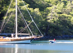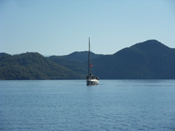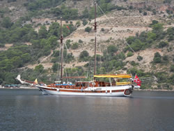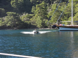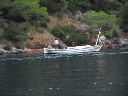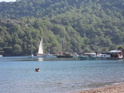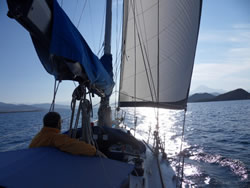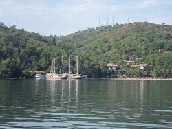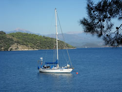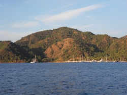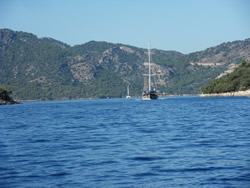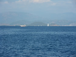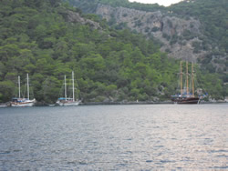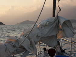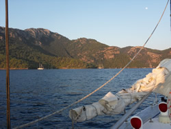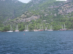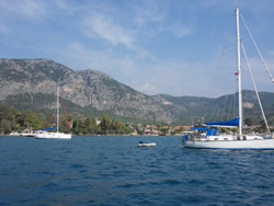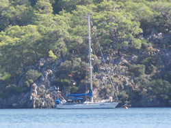 With the northerly blow we had experienced for the last couple of days now over we were to move north, up to Fethiye. There, in the harbour, off the boat yards, we were to attack some of the minor rust problems one always has with a steel boat. Down here, in the Limani where water quality is protected, it seemed wrong to grind and chip away at paint and possibly run the risk of fines? Up in the harbour we had seen many jobs under taken on boats at anchor without problems, we had only two or three days work then we would return or visit Gocek before we leave for the UK. With the weather clearing the traffic started early, a sailboats arriving already, we planned to sit for a while and wait for the local winds to develop, however, they were forecast to be extremely light.
