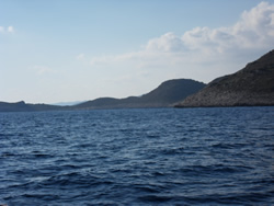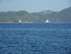 If wind has been available to use we had planned to head out to the south of the Greek island of Kastellórizon, but there was still none so the shortest route was through the adjacent islands to the south of Kas and Kalkan, unfortunately under motor. As we approached the islands there was enough of a head wind to allow us to raise our mainsail and"motor sail", a little saving on fuel and still quickening our pace?