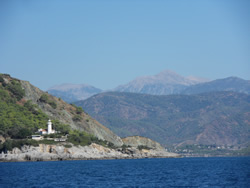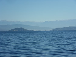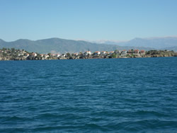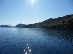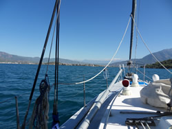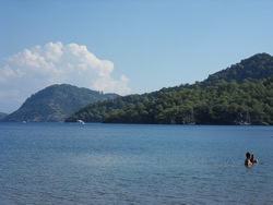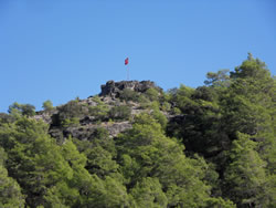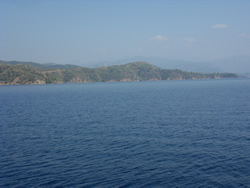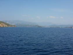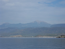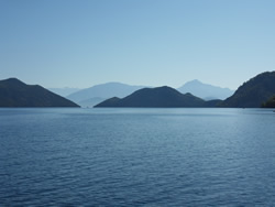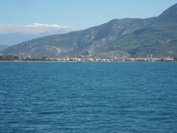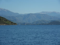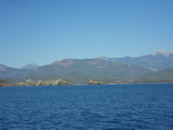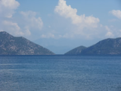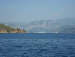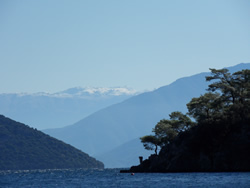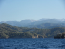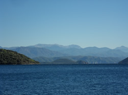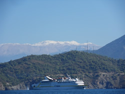 Out into the clear water the wind is still non existent, the engine stays on as we motor almost due east onto Fethiye. With Sailaway on "autopilot" we enjoy the warming sun as it gains strength. The snow on top of the far off mountain cap can still be seen but only now right on the top, upper limits.