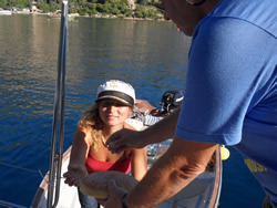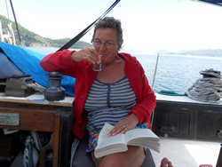 As we sat we also awaited the "bread lady", we were unsure as to the next time we would be shopping so we needed bread. Apart from that it is cooked in open ovens, it carries an "oak type" aroma from the olive wood used to bake it, and of coarse we love it! Ann happens to have the camera out on deck when she arrives and takes a photograph of me buying the bread, the girls laughs. She then insists on having her picture taken alone and takes up what seems a very familiar pose? I am some what confused, then the penny drops "she is clearly married", what attractive lady wouldn't want her picture taken with me?