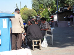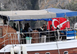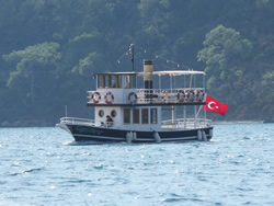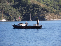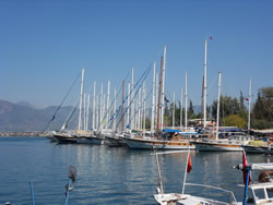 We await the sun warming up the air, burning the mist away then take our dinghy over to Fethiye to pick up some supplies, the usual, fruit, salad etc, etc. It is a very different town to that of our last trip, in the small harbour most of the trip boats and gullets are in, some being prepared for the winter, plenty of painting, sanding and varnishing going on.