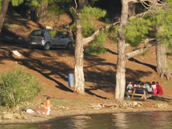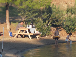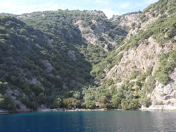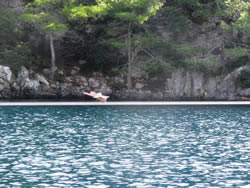 The ravine has a small beach with steep mountainous sides climbing high above us, it's waters edge lined with grand olive trees as opposed to the typical bushes. We are total secluded with no one else in sight, "skinny dipping" in the clear blue water is very tempting. Ann manages to catch me in an embarrassing pose with the camera, however she forgets that I edit?