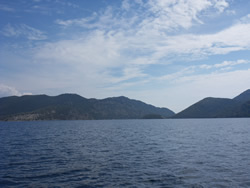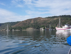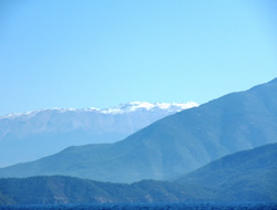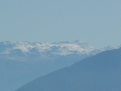 We awoke this morning feeling a little chilly, but the sun was back and most of the cloud has gone. We sat up on deck with our first morning cupper as usual, the difference being today we wore fleeces. The mountains to the north were a lot clearer this morning, to the north east some thing caught our eye - was that snow on the mountain caps? The bitter wind had increased so we moved across the bay for better shelter from it, our quilt cover definitely goes on our bed this evening. The temperatures are to climb no higher than 18C today a little higher for the next week but only four or five degrees, the strong winds/gales out at sea will die off through tomorrow?
