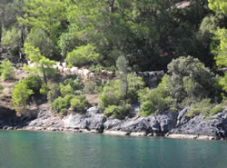 As we sit on board Sailaway having our breakfast on deck, we are distracted by the noise of goats - one of Ann's favour animals, admittedly, the sound of their bells on the hillside is soothing to both of us. We watch as a guy leads about fifty or so goats along a shore side path behind us, taking up the rear of the heard, watching for stragglers is what appears to be his wife, certainly a woman. Their journey must not be a short one as both man and woman are laden with heavy backpacks? We watch them pass and disappear, we were unaware of the existence of the path, and certainly it's destination? We wondered more about the path, with little to do today we decided to walk it, curiosity more than any thing else. We packed a small rucksack with water and bits and pieces, and of coarse the camera, since we missed photographing the shark at Üçagiz we never go any where without it now.