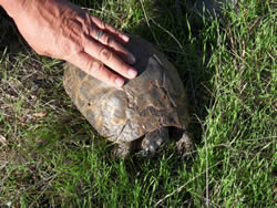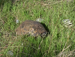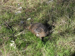 As we made our way through the grove Ann caught sight of a wild tortoise enjoying the sun, as we approached it there was no sign of fear, it appeared to be watching us? When we looked closely at its shell it looked as if it had been the unsuccessful target of some thing, heavy score marks, deep it's shell? Not once did it retract into it's shell even as we paid it more attention, Ann even stroked it and it still continues to watch us. Then, as if bored, it turned and scurried off into the thick grass - we had not realised they could move so fast!